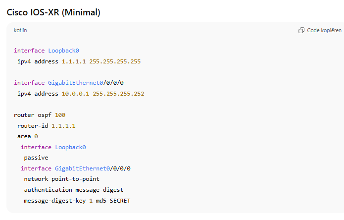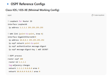 Cisco: show ip ospf interface Gig0/0 (check auth type + key ID)